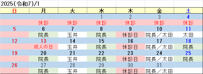 31日(第5)草野3.第2土曜、診療医師は次の通りです。